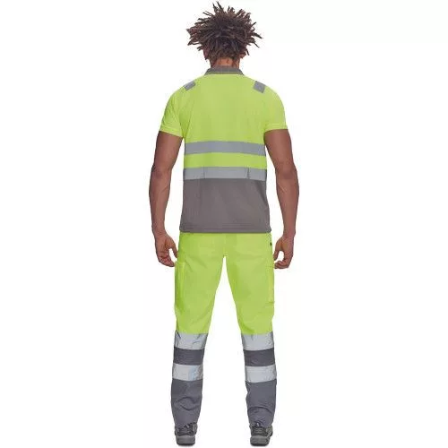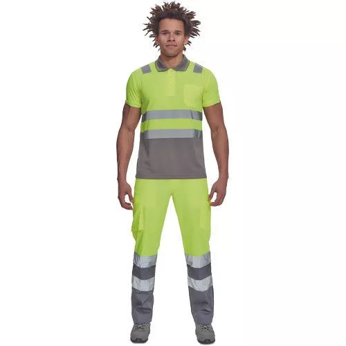 • Hi-Vis pólóing 5 cm vastag fényvisszavető csíkokkal a vállakon és a test körül • 3 gombos nyak • kötött gallér és ujjvégek