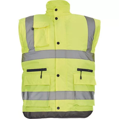 • Hi-Vis bélelt férfi mellény, gallérba rejthető kapucnival • 5 cm széles fényvisszavető csíkok • cipzáras, patentos hajtókával • telefonzseb • 2 nagy első zseb hajtókával, és két cipzáras zseb