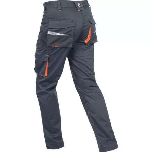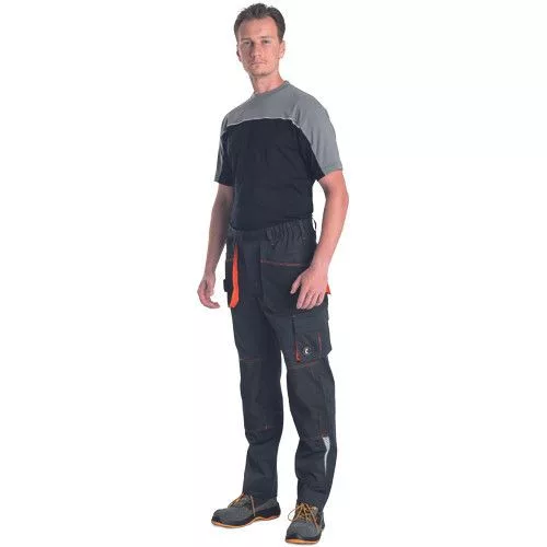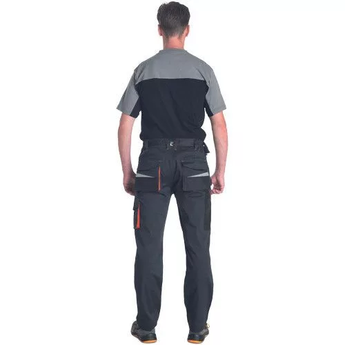 • férfi munkanadrág, rendkívül tartós rugalmas anyagból • elasztikus derékkal • multifunkcionális zsebek • Oxford 600D megerősített térdzsebek térdvédők behelyezéséhez • nyomtatott szegmensekre bontott fényvisszavető részletek • állítható szárhossz