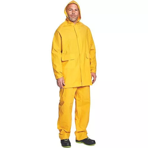 • kétrészes vízálló öltöny – 3/4-es kapucnis esőkabát és rugalmas derekú nadrág • lehegesztett varratokkal • PVC bevonatú poliészterből • 2 mély zsebfedős oldalzseb • patenttal szűkíthető mandzsetták • szellőzőbetétek a háton és a hónaljrészen