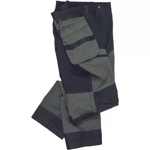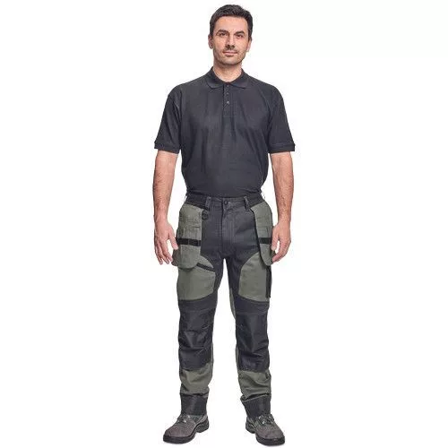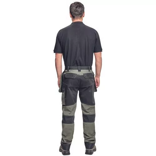 • férfi munkanadrág rugalmas derékkal • 2 oldalsó zseb, két szerszámtartó zsebbel elöl • D-gyűrű • 1 oldalsó zseb a lábon hajtókával • 1 oldalsó zseb cipzárral • 2 hátsó hajtókás zseb • megerősített térdrész, térdvédőtartó • 5 cm-rel meghosszabbítható nadrágszárak • a nadrág hátsó, alsó része megerősített • dekoratív varratok • 265 g/m2