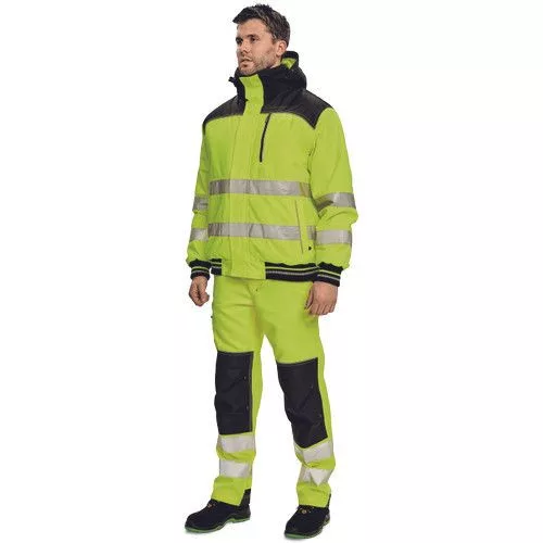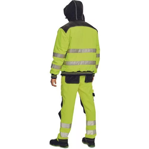 • férfi párnázott jólláthatósági pilótadzseki lecsatolható kapucnival • megerősített vállrész • cipzáras elütő színű mellzseb • 2 oldalzseb • zárható belsőzseb • a vállrészen és a zsebeken fényvisszavető szegély van • dekoratív varrás