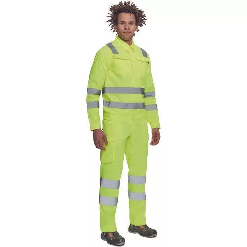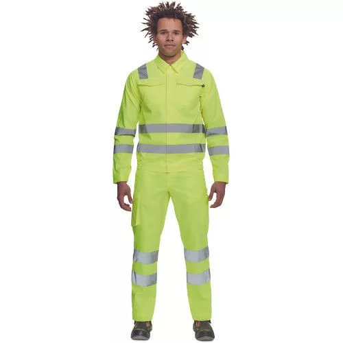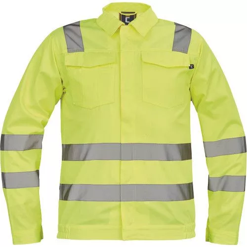 • férfi Hi-Vis kabát 5 cm széles fényvisszavető csíkokkal • cipzáras, tépőzáras hajtókával • 2 nagy hajtókás mellkasi zseb • rugalmas oldalsó betétek a kabát alján • tépőzáras mandzsetta