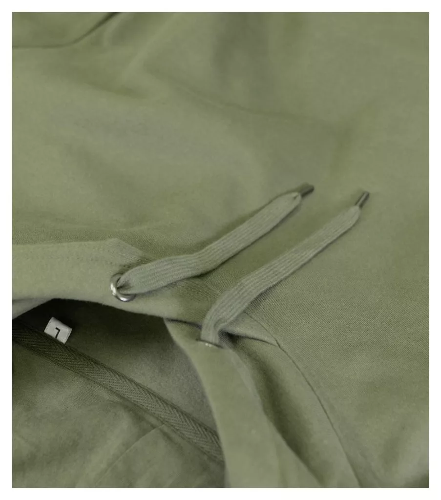 címkementes - egyedileg márkázható, laza szabású, oldalvarrással, zsinórral összehúzható, bélelt kapucni, méretcímke természetes anyagból a hátsó nyakrészen, hátsó nyakszegély belső oldala saját színű anyagból, low cap ujjak, rejtett kenguru zsebek, 2:2 bordás kötésű szegély és mandzsetták 5 % elasztánnal, bolyhos belső oldal