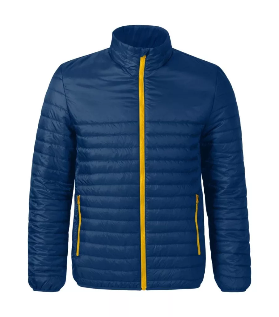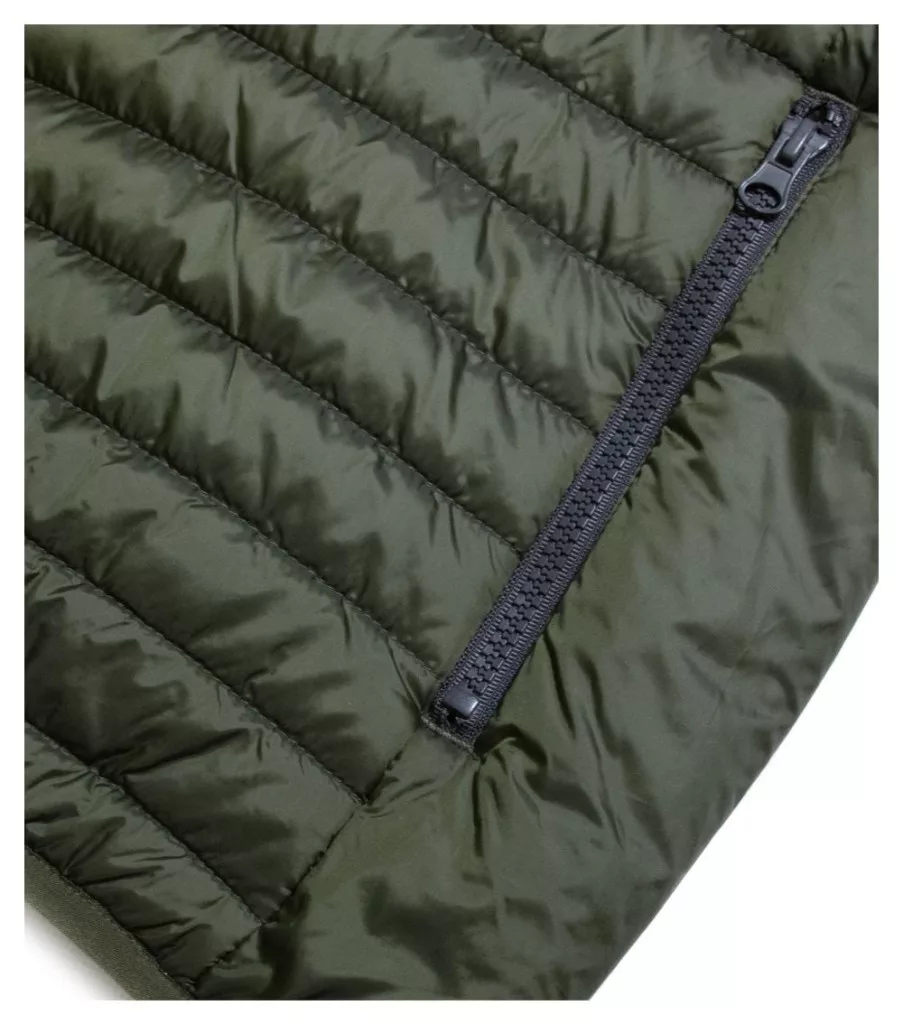 a belső zsebbe behajtható, steppelt könnyű, meleg anyag, egyenes szabás oldalrészekkel, műanyag cipzár teljes hosszban állvédővel, zsebek műanyag cipzárral, belső zseb tépőzárral, oldalrészen hozzáférés az emblémázáshoz, elasztikus szegély