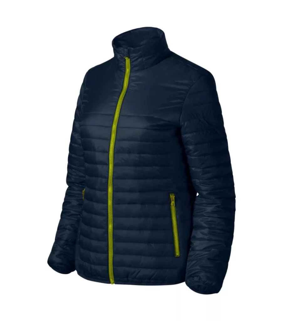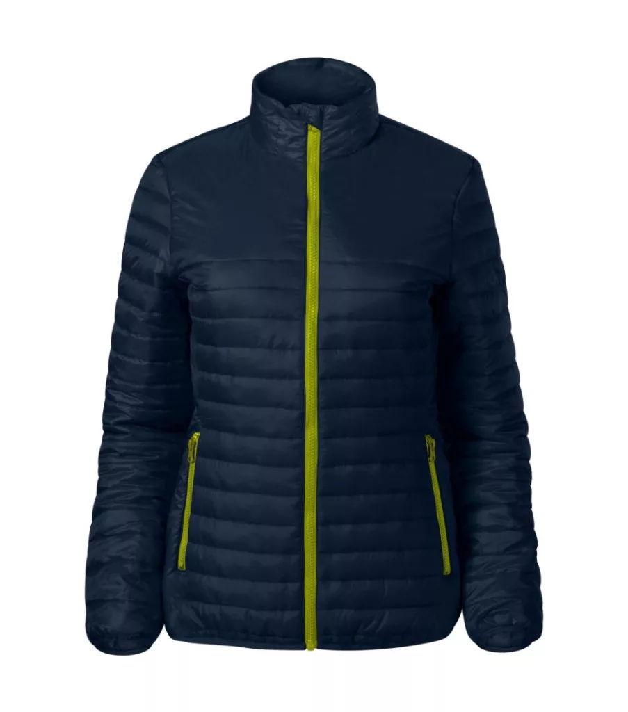 a belső zsebbe behajtható, steppelt könnyű, meleg anyag, karcsúra szabott oldalrésszel, műanyag cipzár teljes hosszban állvédővel, zsebek műanyag cipzárral, belső zseb tépőzárral, oldalrészen hozzáférés az emblémázáshoz, elasztikus szegély