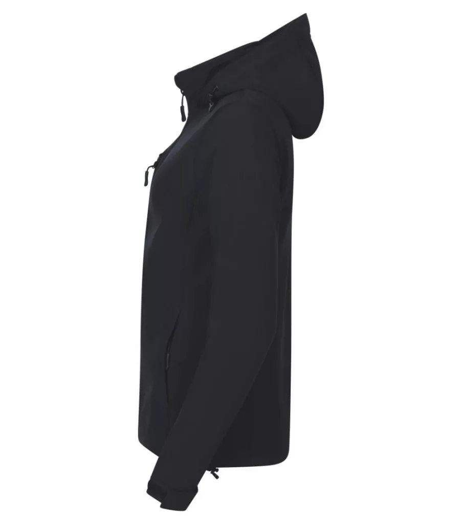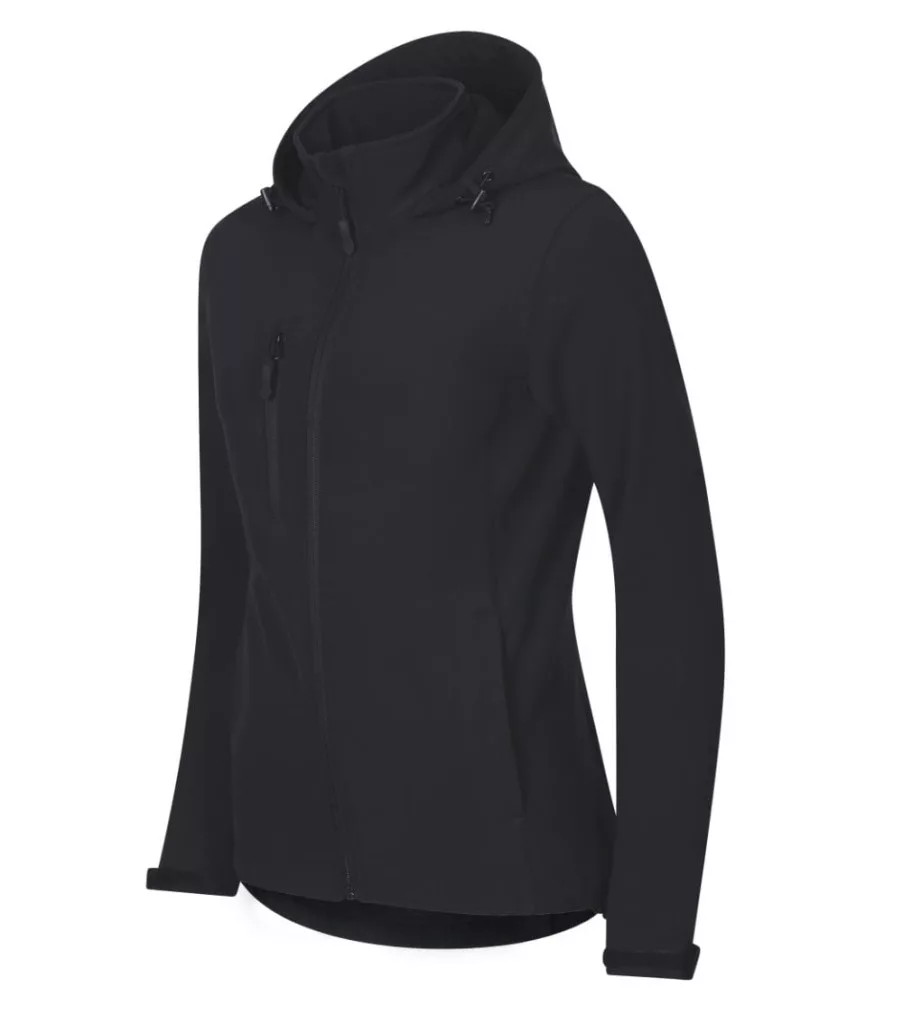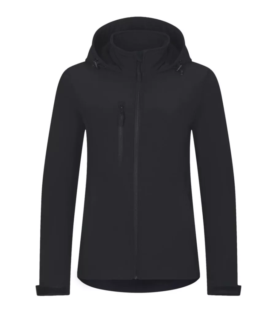 címkementes - egyedileg márkázható, 2-régetű softshell, ívelt szabás, fordított cipzár teljes hosszban állvédővel, elasztikus húzózsinór a kapucniban és az alsó szegélynél, méretcímke természetes anyagból a hátsó nyakrészen, állítható ujjvégek tépőzárral, zsebek fordított cipzárral, mellzsebek , ívelt, hátul kissé hosszított alj, belső polár bolyhosodás ellen kezelve