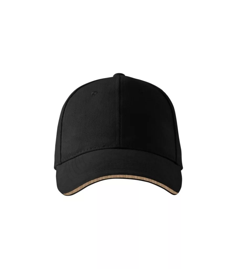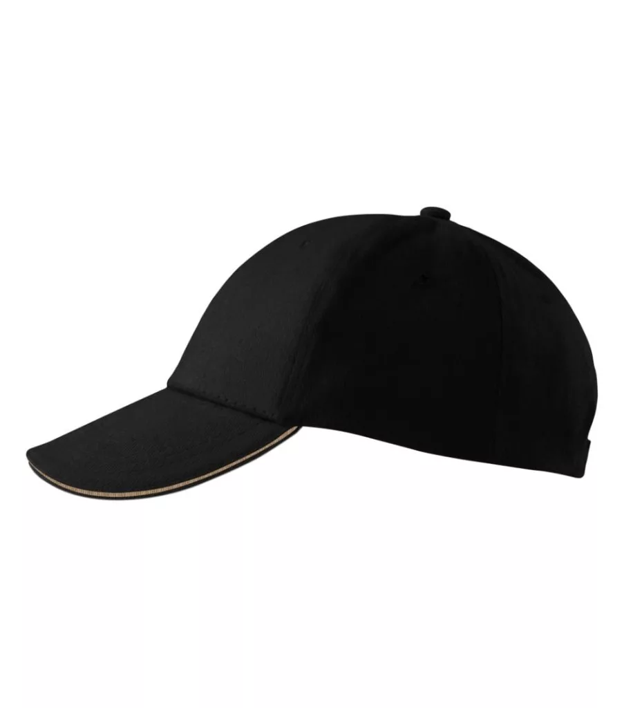 hatpaneles szabás, összekapcsolt 2 első panel, varrott, enyhén hajlított felső rész kontraszt csíkkal, hímzett légáteresztő lyukak, nedvszívó pánt, rézkapcsokkal állítható méret