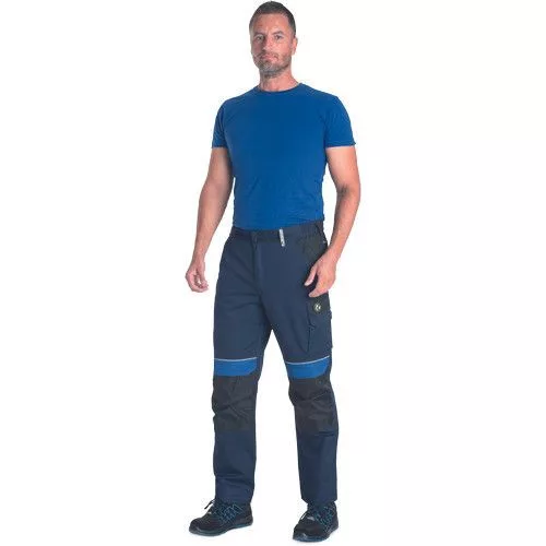 • férfi munkanadrág rugalmas derékpánttal • 2 oldalzseb • 1 bal combzseb • 2 hátsó zseb tépőzárral • térdrész erősítés opcionálisan behelyezhető térdpárnával • fényvisszavető részletek • állítható szárhossz