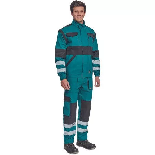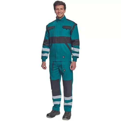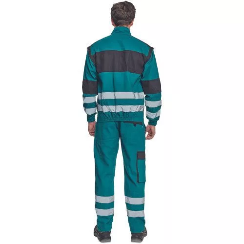 • férfi cipzáras munkakabát levehető újakkal • 2 első zseb • 2 mellzseb • megerősítés a váll és könyök részeken • rugalmas mandzsetta és alsó derékszegély • fényvisszavető csíkok az ujjakon és a kabát hátán, anyag: 100% pamut, anyagvastagság: 260 g/m2