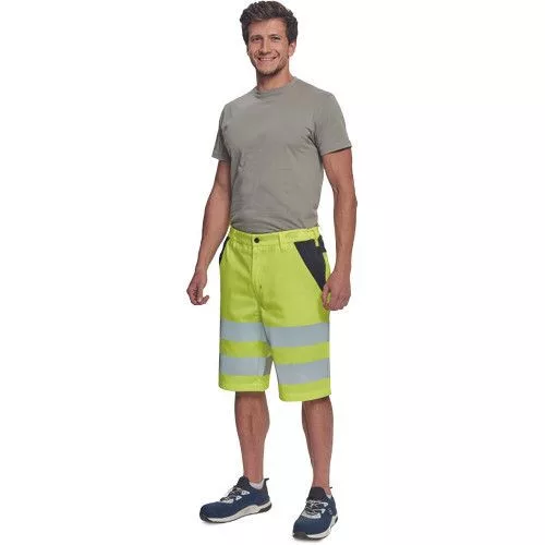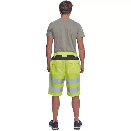 • férfi HI-VIS rövidnadrág rugalmas derékkal • 2 első zseb, 2 hátsó zseb • két 7 cm-es nyomtatott fényvisszavető csík a comb körül • fényvisszavető szegés