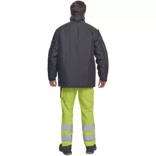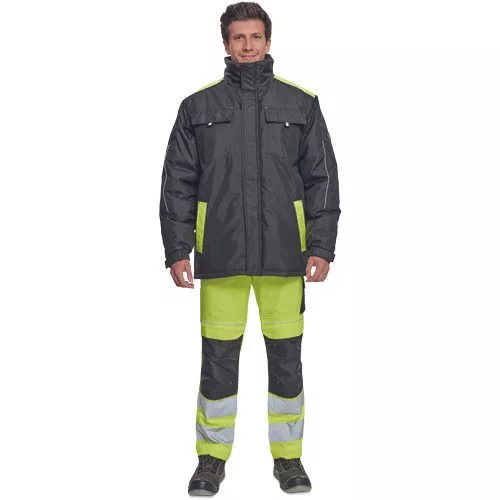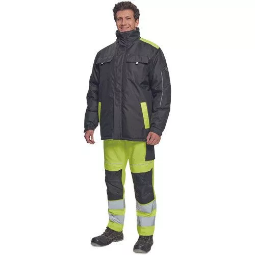 • férfi téli kabát • tépőzáras takarópánttal fedett cipzár • 2 oldalsó zseb, 2 mellzseb • 1 belső mobiltelefonzseb • rugalmas mandzsetta tépőzárral • fényvisszavető szegés