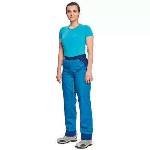 • női munkanadrág könnyű pamut-PES kevertszálas anyagból • dekoratív paszpol kontrasztos színekkel • légáteresztő, köszönhetően hálós betéteknek • teljesen fedett cipzár és zsebek • a derékbőség állítható az oldalán található tépőzárnak köszönhetően • a nadrágszárak hossza 5 cm-rel eghosszabbítható • 2 oldalsó zseb, az egyikben D-gyűrű található • 1 hátsó zseb • tartós anyagú • puhább, hajlékonyabb szövet