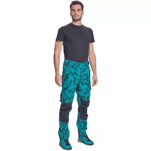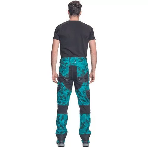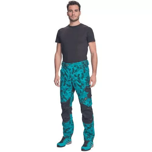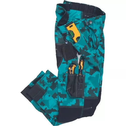 férfi munkanadrág innovatív, rugalmas TRIFIBETEX® anyagból, CORDURA® betétekkel digitális terepmintával, elöl 2 ékzseb, hátul 2 tépőzáras foltzseb, bal oldalt nagy multifunkciós zseb, jobb oldalt multifunkciós vonalzó, kés és ceruzatartó, fém D gyűrű, rugalmas derék, hosszabbítható szárhossz, fényvisszavető elemek, dekoratív tripla varrás kontrasztos színnel, kalapácstartó