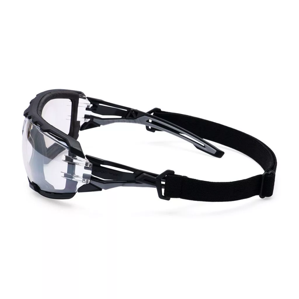 Széles állítható fejpántokkal, belső habszivacs tömítéssel, a panorámás kilátásért wrap-around stílussal, befecskendezett, kétszínű és rendkívül rugalmas szárakkal, kivételesen jó, univerzális illeszkedéssel, formázott orr-résszel, karcolásgátló és párásodásgátló bevonattal, UV védelemmel, kisker kihelyezést segítő csomagolással, automatákhoz egyedi csomagolással és CE minősítéssel rendelkező védőszemüveg, amely 100% fémmentes.