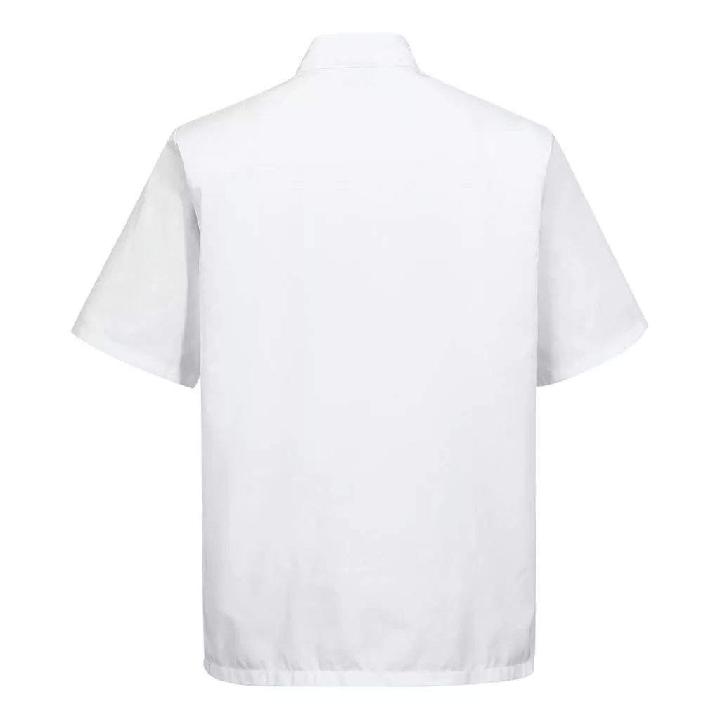 Meleg munkakörnyezetre tervezett, séfek részére tervezett rövidujjú kabát, mandaringallérral, többfunkciós, stílusos unisex fazonban. Klasszikus szabású, magas minőségű, könnyen kezelhető munkaruha modell, kopásálló, tartós, színtartó anyagból készül, ami mosás után is megtartja méretét. Ötsoros kivitelű, cserélhető gombokkal rendelkezik, valamint egy zsebbel van ellátva a biztonságos tárolás érdekében.