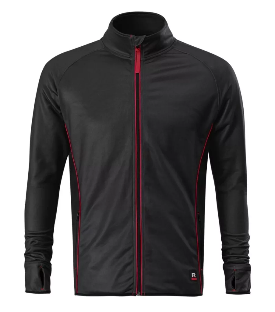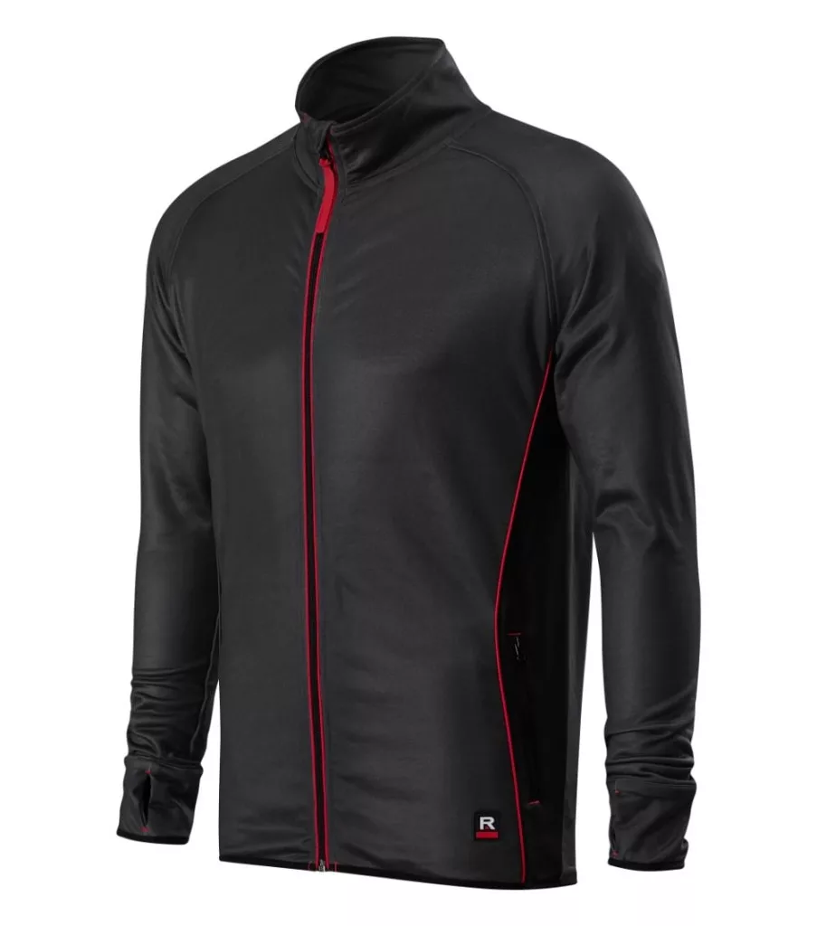 sima, rugalmas, gyorsan száradó anyag, egyenes szabás oldalvarrással, fordított cipzár teljes hosszban állvédővel, belső nyakrész szegéllyel, raglán ujjak , mandzsettán hüvelykujjnak kialakított nyílás, cipzáras zsebek, elasztikus szegély, kontraszt elemek, akasztó