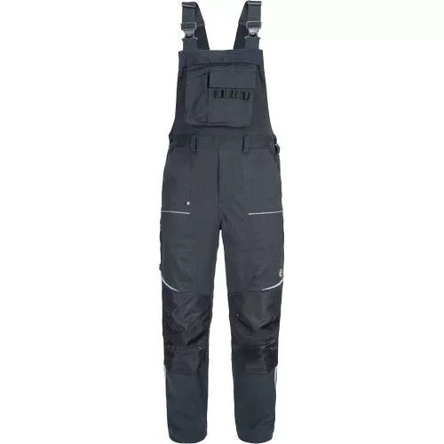 • men's working bip pants made of stretch fabric • elastic waistband with belt loops • 2 front pockets, 2 back pockets • 2 zipped thigh mesh ventilating pockets • 1 right side multifunctional pocket • 1 multifunctional chest pocket • reinforced knee parts for insertion of knee pads • reflective piping and printed details • legs extendable by 5 cm