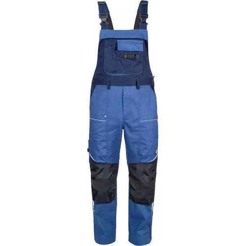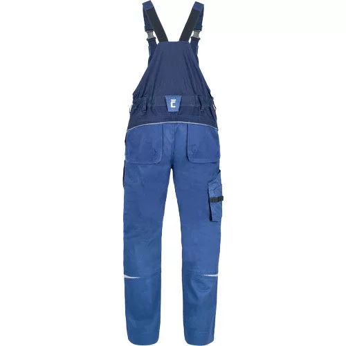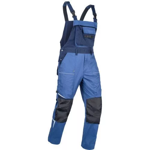 • men's working bip pants made of stretch fabric • elastic waistband with belt loops • 2 front pockets, 2 back pockets • 2 zipped thigh mesh ventilating pockets • 1 right side multifunctional pocket • 1 multifunctional chest pocket • reinforced knee parts for insertion of knee pads • reflective piping and printed details • legs extendable by 5 cm