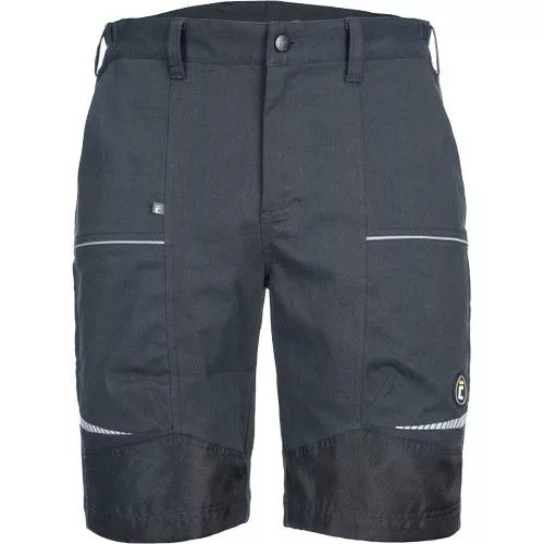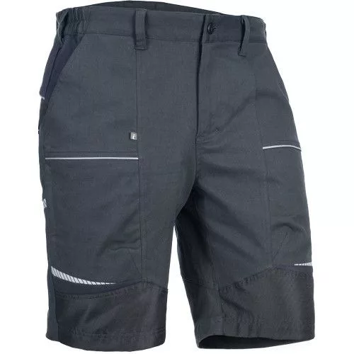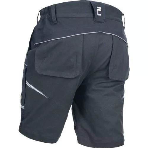 • men's working shorts made of stretch fabric • elastic waistband with belt loops • 2 front pockets, 2 back pockets • 2 zipped thigh mesh ventilating pockets • reinforced front legs parts • reflective piping and printed details
